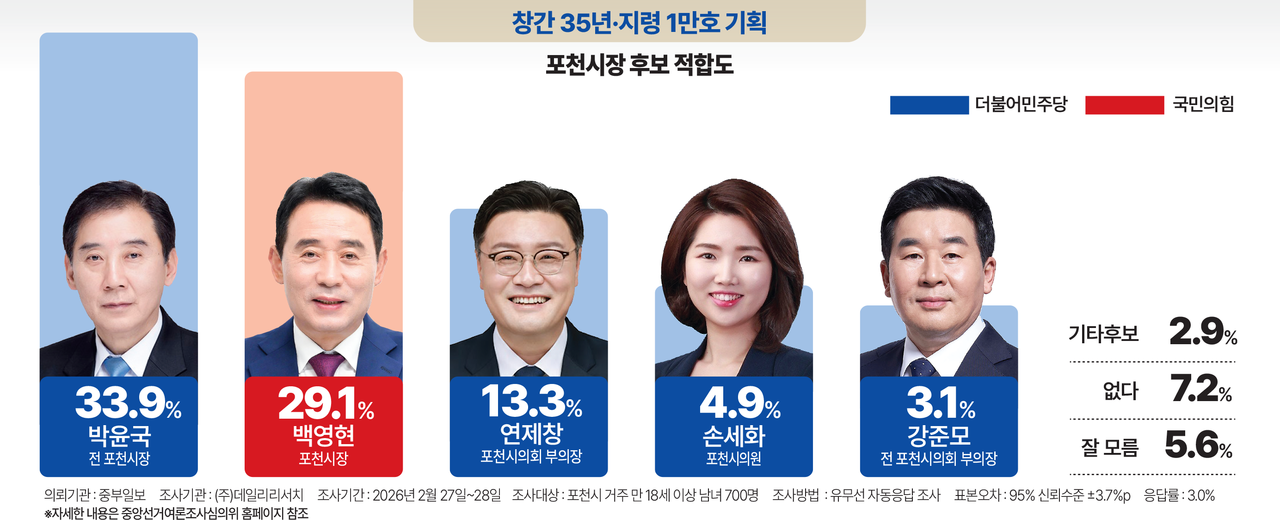 중부일보 의뢰, 데일리리서치 2월 27일-28일 포천시 거주 만 18세 이상 남녀 700명 대상 조사