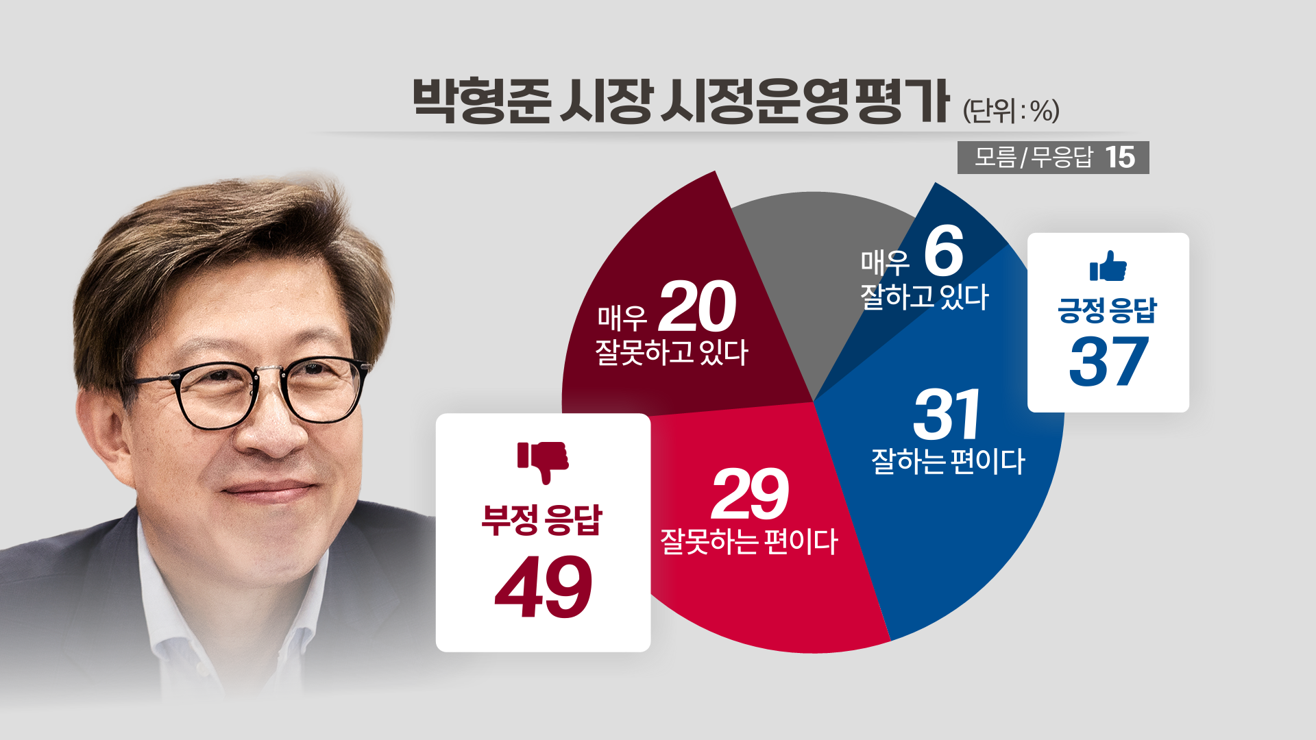 - 이념 성향별 여론조사도 진행했습니다. 자신이 '보수'라고 한 응답자 중 51%가 박 시장 시정을 긍정적으로 평가한 데 반해, '진보'와 '중도' 응답자는 박 시장 시정 운영을 부정적으로 평가한 비율이 높았습니다. 특히 중도층에서는 부정 평가 55%, 긍정 평가가 30%로, 25%p 격차가 났습니다.