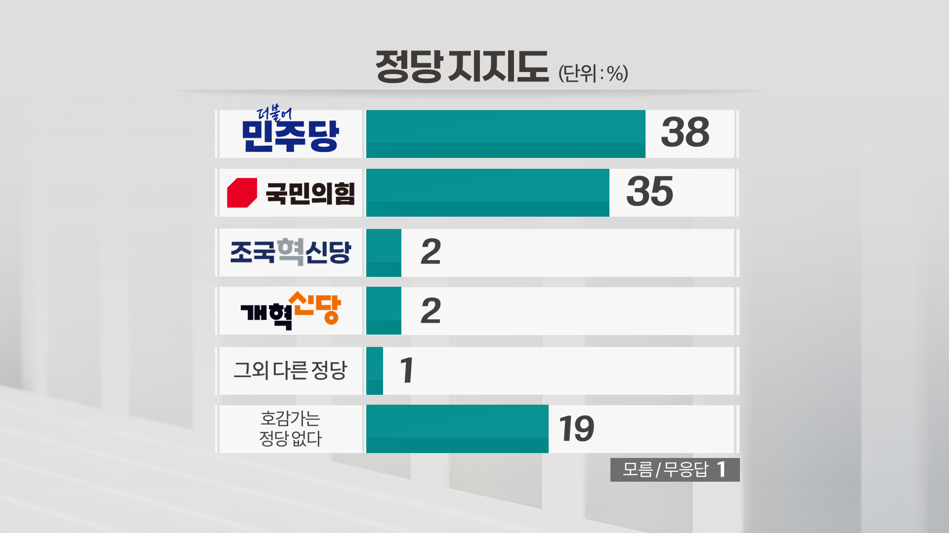 더불어민주당 38%, 국민의힘 35%, 조국혁신당 2%, 개혁신당 2%, 호감 가는 정당이 없다 19%