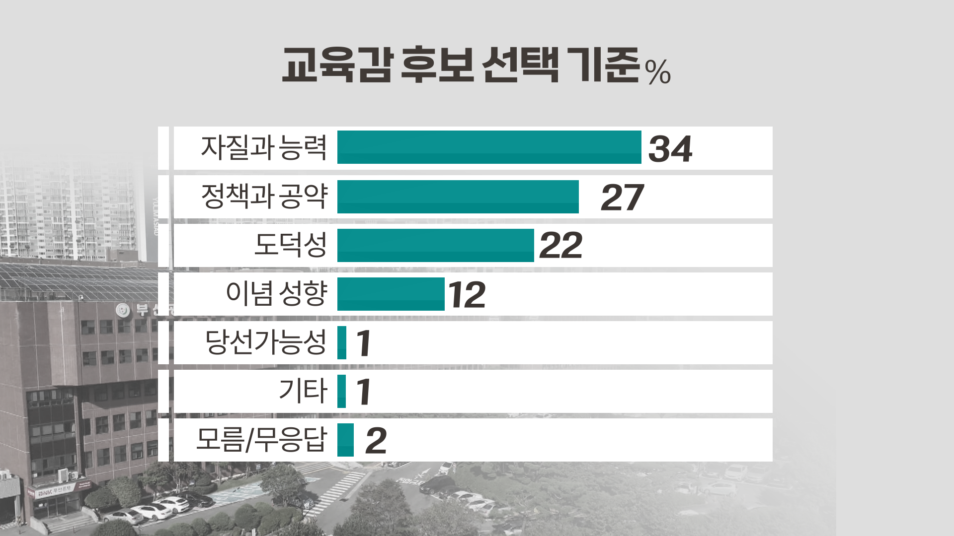 자질과 능력 34%, 정책과 공약, 도덕성, 후보의 이념 성향 12%
