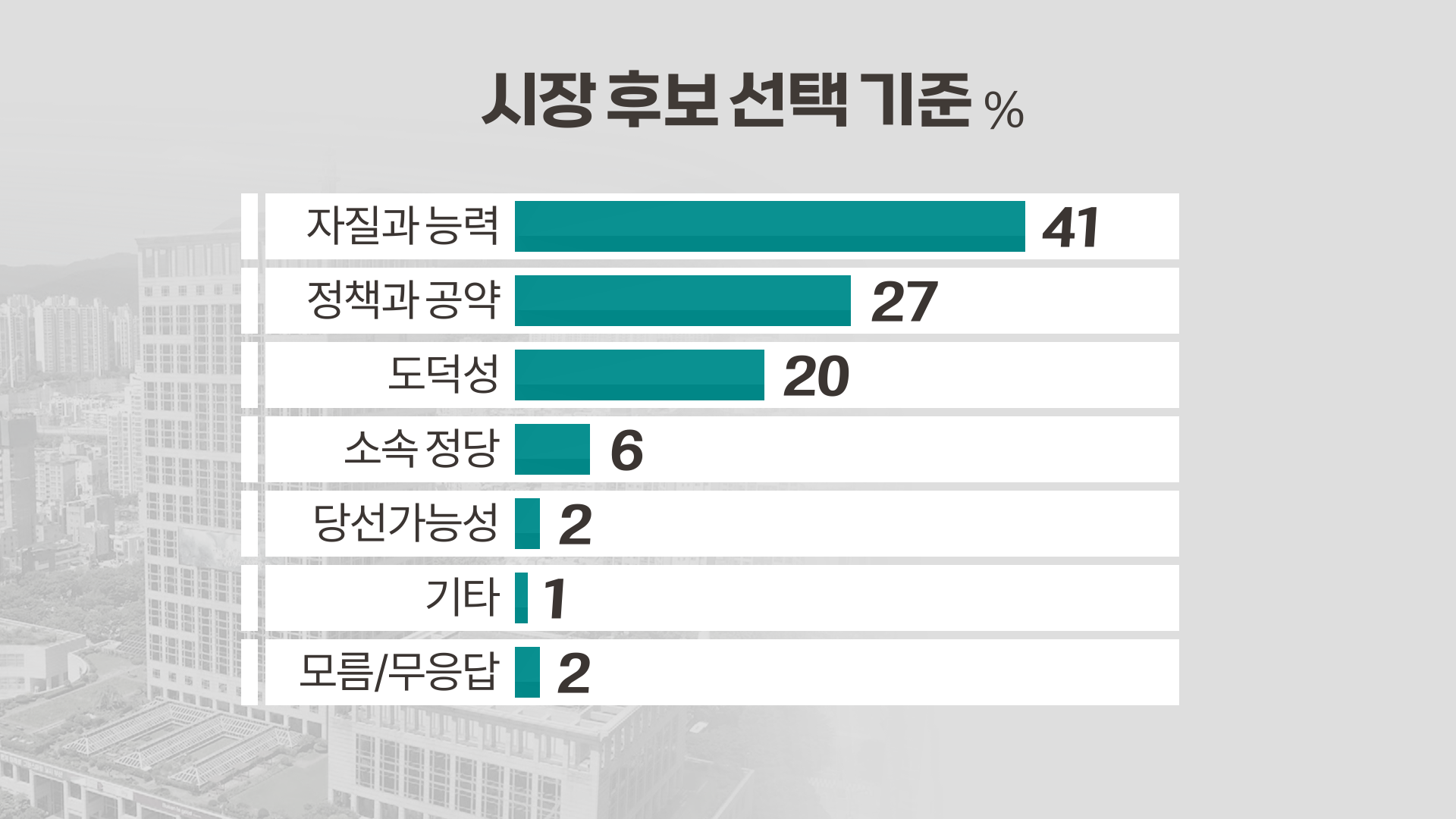 자질과 능력 41%, 정책과 공약 27%, 도덕성 20%, 소속 정당 6%
