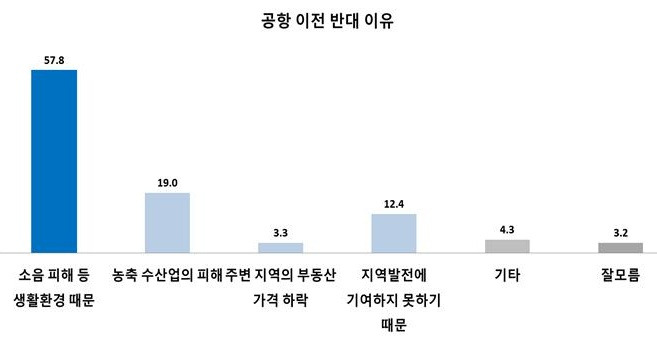 소음 피해 등 생활환경 때문 57.8%, 농축수산업의 피해 19.0%, 지역발전에 기여하지 못하기 때문 12.4%, 주변 지역의 부동산 가격 하락 3.3%, 기타 4.3%, 잘 모름 3.2%