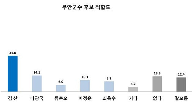 김산 현 무안군수 31.0%, 나광국 도의원 14.1%, 류춘오 현 무안군체육회장 6.0%, 이정운 전 무안군의회 의장 10.1%, 최옥수 전 무안군 산림조합장 8.9%, 잘 모름 12.4%, 지지후보 없음 13.3%, 기타 4.2%