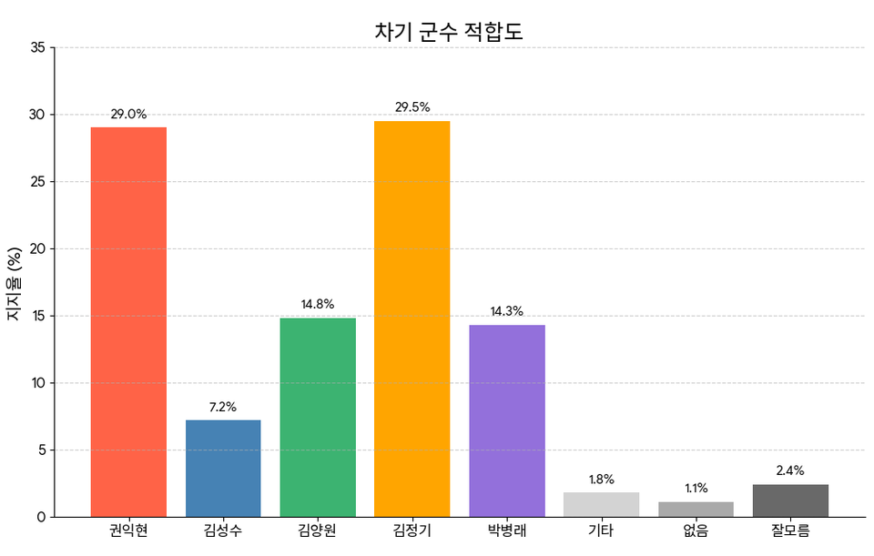 - 정당 지지층별로는 민주당 지지층에서 권 군수가 31.8%로 김 도의원(30.0%)을 소폭 앞섰고, 박 의장(18.2%), 김 전 부시장(14.6%)이 뒤를 이었다.