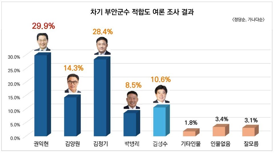 권익현 현 군수 29.9%, 김정기 전북도의원 28.4%, 김양원 전 전주 부시장 14.3%, 조국혁신당 김성수 전 부안군 의장 10.6%, 박병래 의장 8.5%, 적합한 인물이 없다 3.4%, 잘 모르겠다 3.1%, 기타 인물 1.8%