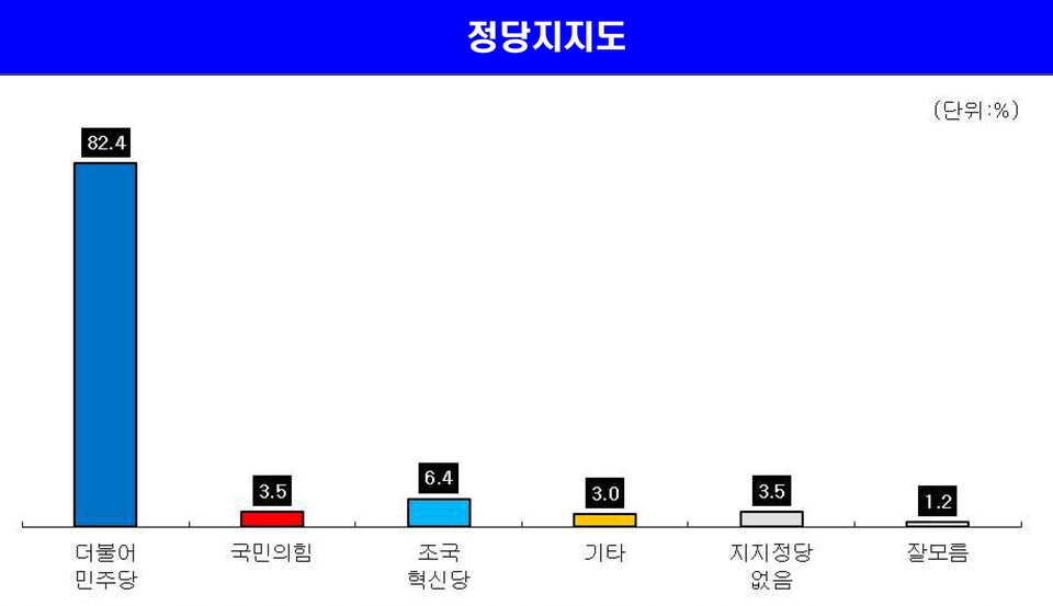 민주당 82.4%, 조국혁신당 6.4%, 국민의힘 3.5%, 그 외 기타 정당 3.0%, 지지하는 정당이 없다 3.5%, 잘 모른다 1.2%