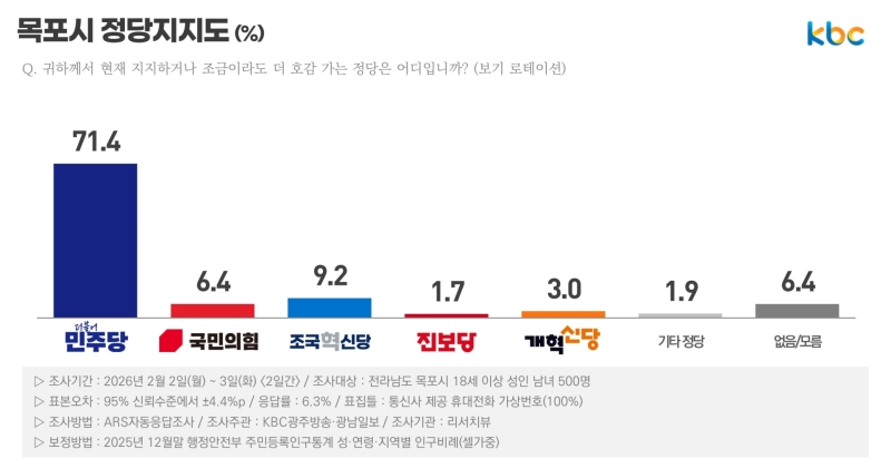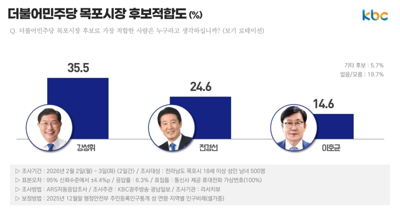 KBC 광주방송 의뢰, 리서치뷰 2월 2~3일 목포시민 500명 대상 조사