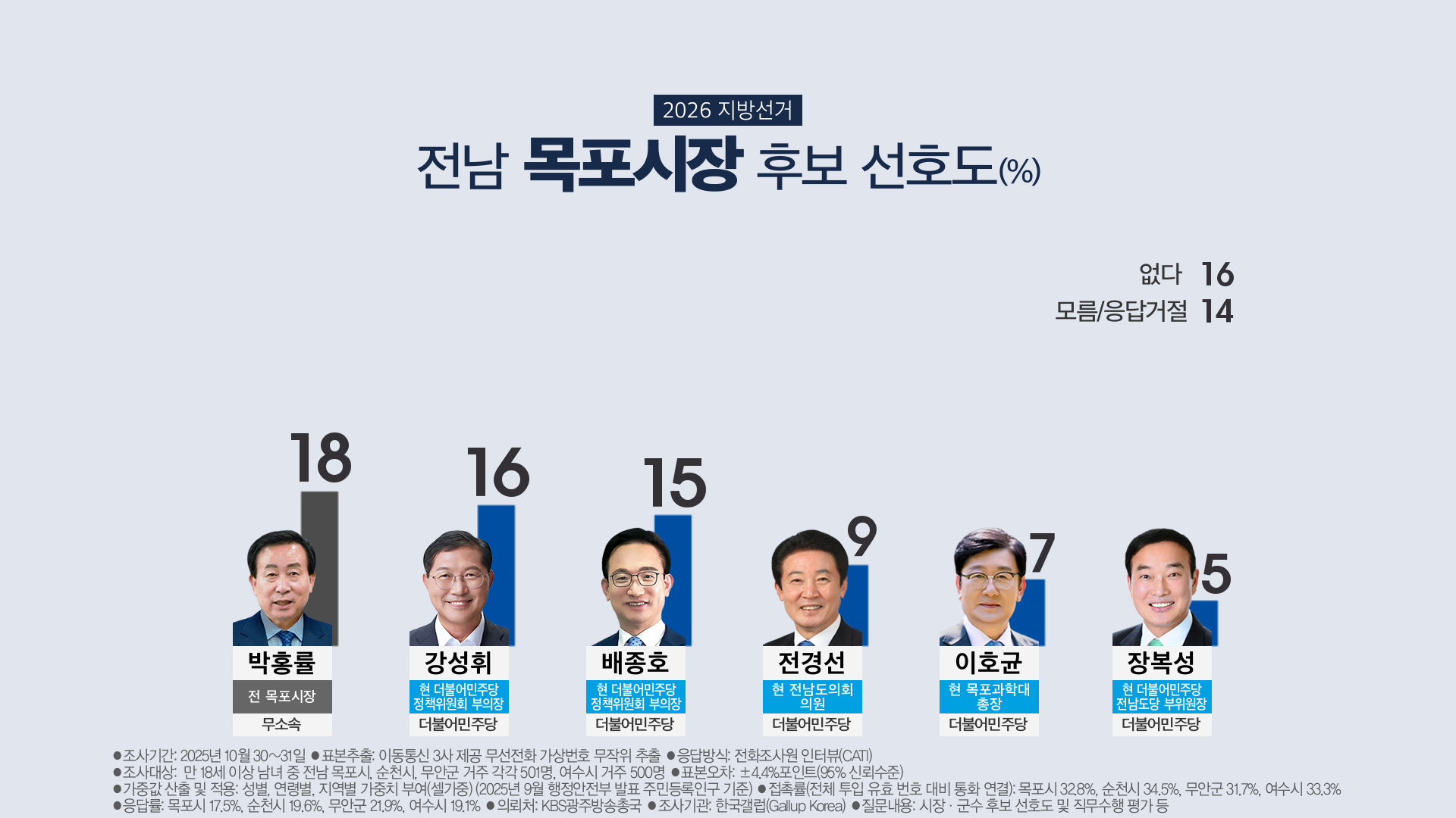 박홍률 전 시장 18%, 강성휘 더불어민주당 정책위원회 부의장 16%, 배종호 민주당 정책위원회 부의장 15%, 전경선 전남도의원 9%, 이호균 목포과학대 총장 7%, 장복성 민주당 전남도당 부위원장 5%, 30%