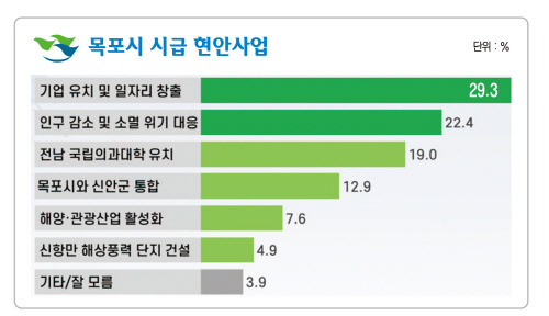 ‘기업 유치 및 일자리 창출’ 29.3%, ‘인구 감소 및 소멸 위기 대응’ 22.4%, ‘전남 국립의과대학 유치’ 19.0%, ‘목포시와 신안군 통합’ 12.9%, ‘해양·관광산업 활성화’ 7.6%, ‘신항만 해상풍력 단지 건설’ 4.9%