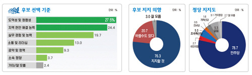 ‘도덕성 및 청렴성’ 27.5%, ‘지역 현안 해결 능력’ 24.4%, ‘실무 경험 및 능력’ 19.7%, ‘소통 및 리더십’ 13.0%, ‘공약 및 정책’ 9.3%, ‘소속 정당’ 3.7%