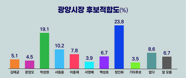 정인화 현 광양시장 23.8%, 박성현 전 여수광양항만공사 사장 19.1%, 서동용 전 국회의원 10.2%, 이충재 현 더불어민주당 순천광양곡성구례을지역위원회 부위원장 7.8%, 백성호 현 광양시의원 6.7%, 김태균 현 전남도의회 의장 5.1%, 문양오 전 광양시의회 부의장 4.5%, 서영배 현 광양시의원 3.9%, 기타후보 3.5%, 적합한 후보가 없음 8.6%, 잘모르겠다 6.7%
