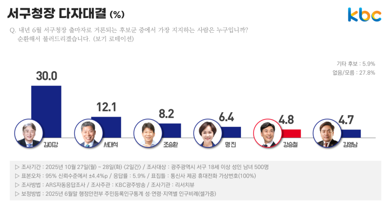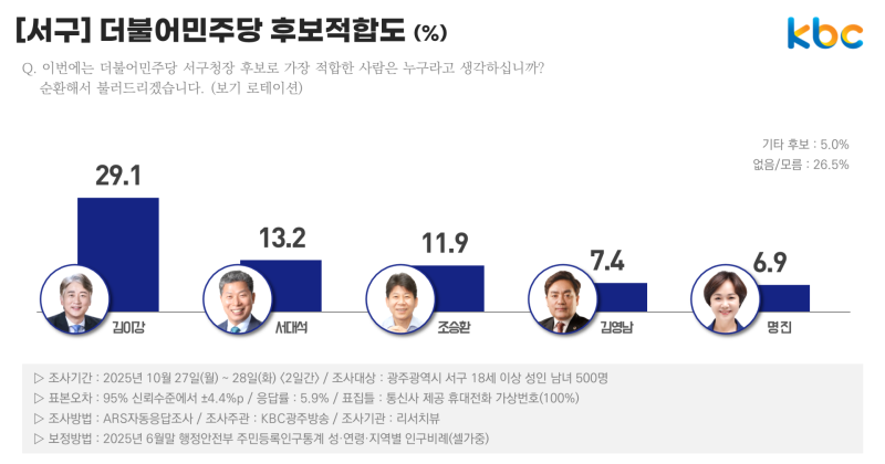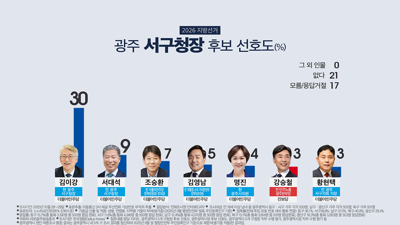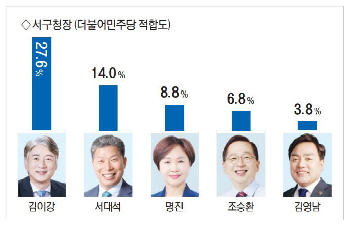 김이강 현 청장 30%, 서대석 전 서구청장 9%, 조승환 더불어민주당 정책위원회 부의장 7%, 김영남 전 대통령소속 자치분권위원회 정책 자문위원 5%, 명진 광주시의원 4%, 강승철 전 민주노총 광주본부장과 황현택 전 광주 서구의회 의장 각각 3%, 지지후보가 없다 21%, 모르거나 응답 거절 17%
