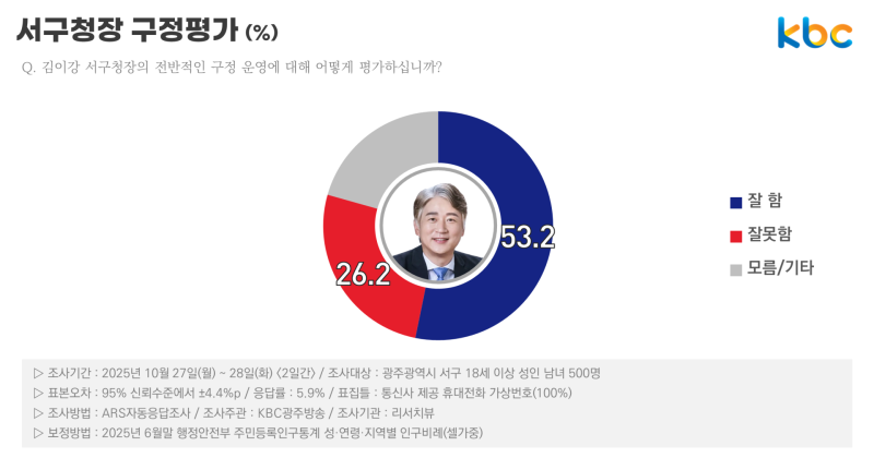 KBC 광주방송 의뢰, 리서치뷰 10월 27~28일 광주 서구 거주 만 18세 이상 유권자 500명 대상 조사