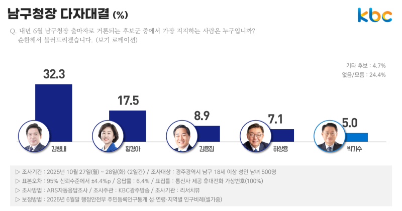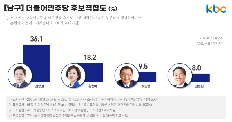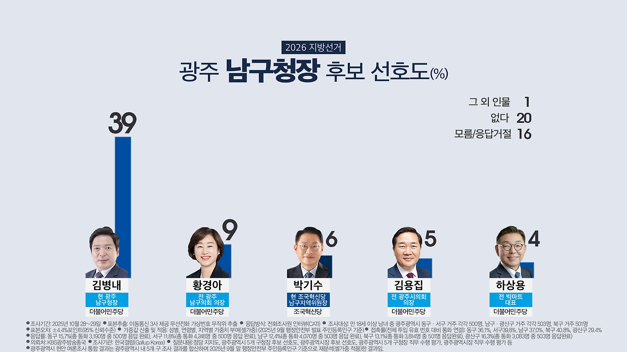 김병내 현 청장 39%, 황경아 전 광주 남구의회 의장 9%, 박기수 현 조국혁신당 남구 지역 위원장 6%, 김용집 전 광주시의회 의장 5%, 하상용 전 빅마트 대표 4%, 부동층 36%