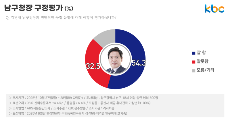 KBC 광주방송 의뢰, 리서치뷰 10월 27일-28일 광주광역시 남구 거주 만 18세 이상 유권자 500명 대상 조사