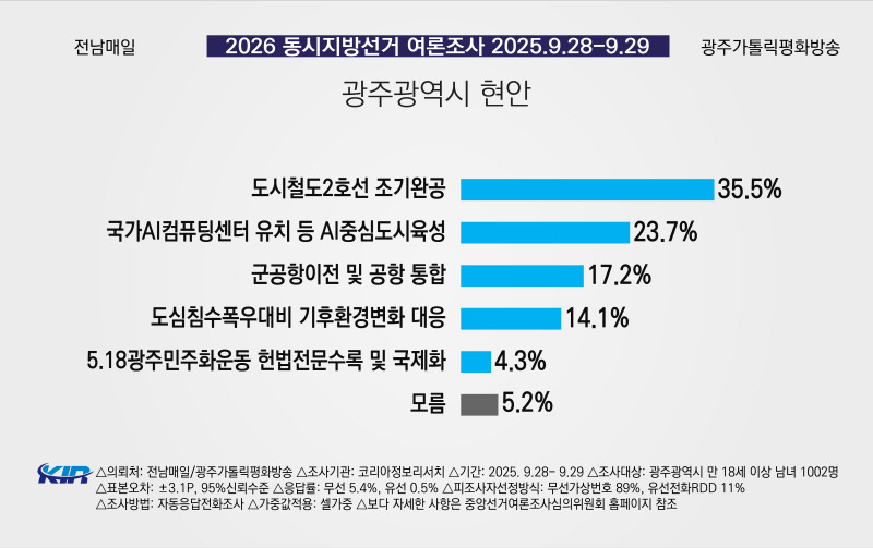 ‘도시철도 2호선 조기 완공’ 35.5%, 국가AI컴퓨팅센터 유치 등 AI 중심도시 육성 23.7%, 군공항 이전·공항통합 17.2%, 도심 침수·기후환경변화 대응 14.1%, 5·18민주화운동 헌법 전문 수록 및 국제화 4.3%