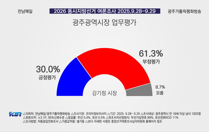 * 이번 조사는 전남매일과 광주가톨릭평화방송 공동으로 여론조사 전문기관 코리아정보리서치에 의뢰해 9월 28일, 29일 이틀간 광주광역시에 거주하는 만 18세 이상 남녀 1002명을 대상으로, 무선전화 가상번호(89%)와 유선전화 RDD(11%)를 이용한 자동응답 방식으로 진행됐다. 응답률은 무선전화 5.4%, 유선전화 0.5%이고, 표본오차는 95%의 신뢰수준에 ±3.1%p다. 통계보정은 2025년 8월 말 행정안전부 발표 주민등록 인구 기준 성, 연령, 지역별 셀가중값을 부여했다. 자세한 내용은 중앙여론조사심의위원회 홈페이지를 참고하면 된다.
