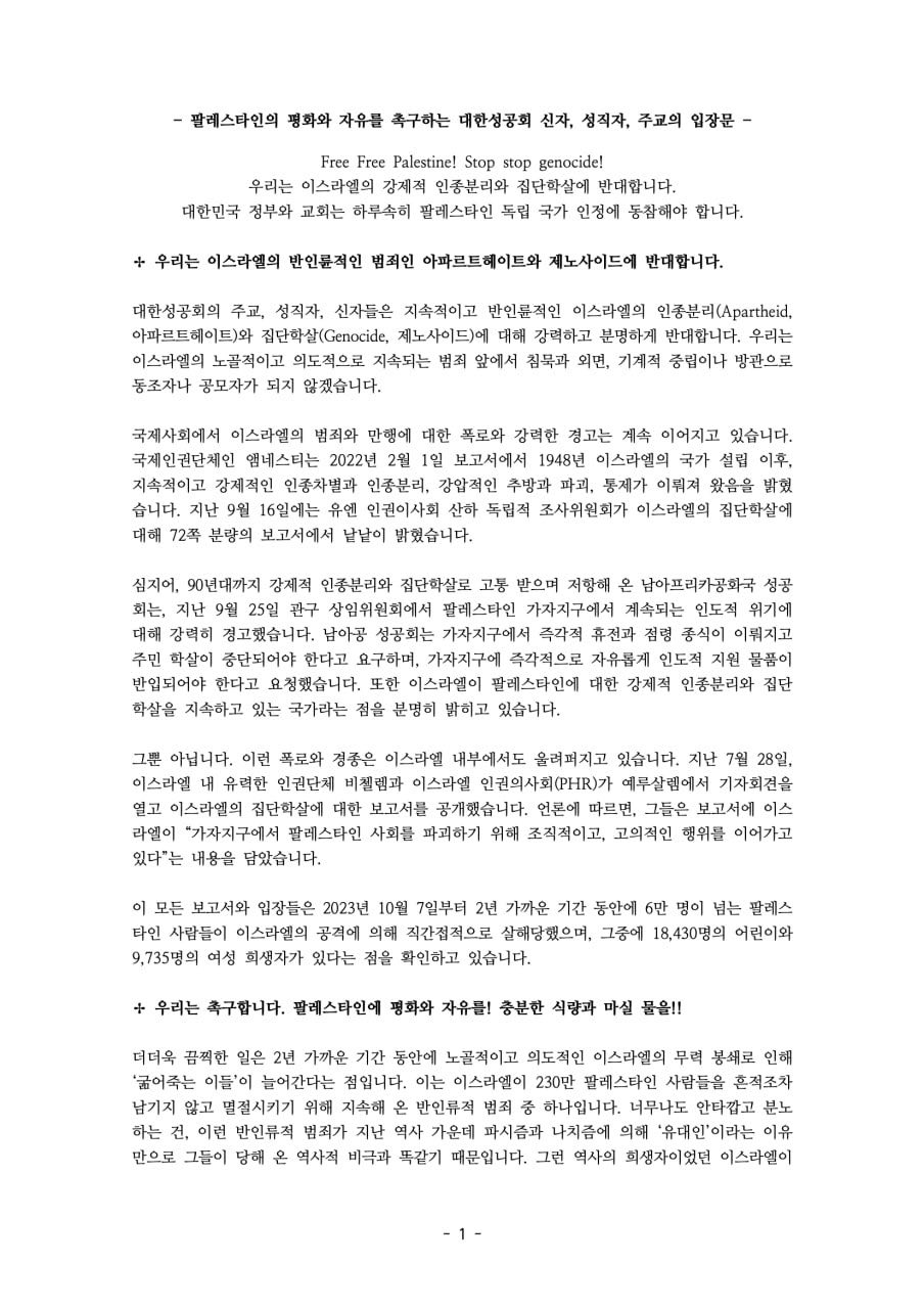 대한성공회의 주교, 성직자, 신자들은 지속적이고 반인륜적인 이스라엘의 인종분리(Apartheid, 아파르트헤이트)와 집단학살(Genocide, 제노사이드)에 대해 강력하고 분명하게 반대합니다. 우리는 이스라엘의 노골적이고 의도적으로 지속되는 범죄 앞에서 침묵과 외면, 기계적 중립이나 방관으로 동조자나 공모자가 되지 않겠습니다.