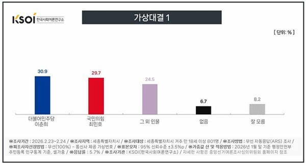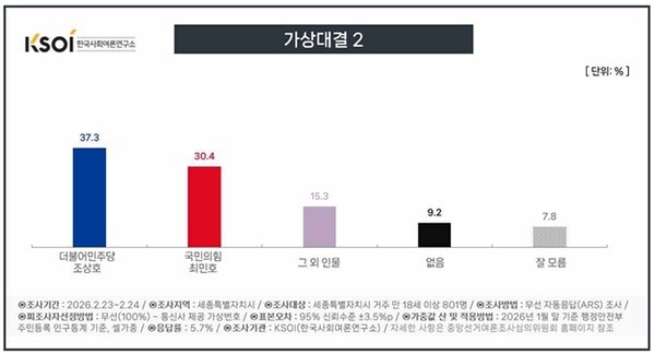 최민호 현 세종시장(국민의힘) 30.4%, 조상호 전 이재명 정부 국정기획위원 37.3%