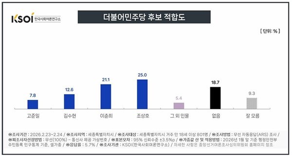 조상호 전 이재명 정부 국정기획위원 25.0%, 이춘희 전 세종시장 21.1%, 김수현 더민주세종혁신회의 상임대표 12.6%, 고준일 전 세종시의회 의장 7.8%, 그 외 인물 5.4%, 없음 18.7%, 잘 모름 9.3%