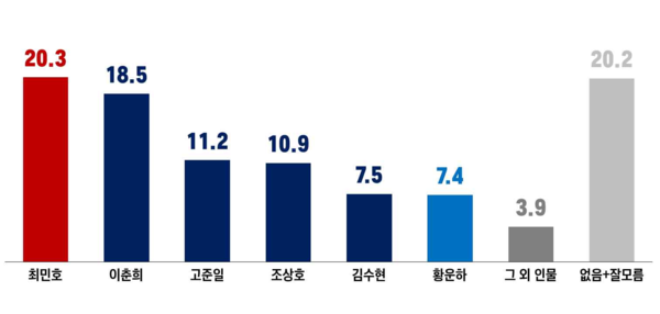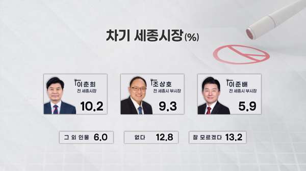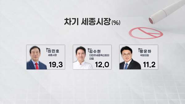 최민호 세종시장 19.3%, 김수현 더민주세종혁신회의 대표 12.0%, 조국혁신당 황운하 국회의원 11.2%, 이춘희 전 세종시장 10.2%, 조상호 전 세종시 부시장 9.3%, 이준배 전 세종시 부시장 5.9%, 잘 모름 13.2%, 없다 12.8% 그 외 6.0%