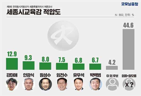 강미애 소장 12.9%, 안광식 세종교육희망연구소 상임대표 9.3%, 원성수 전 공주대학교 총장 8.0%, 임전수 세종교육연구원장 7.5%, 유우석 세종마을교육연구소장 6.8%, 박백범 전 교육부 차관 6.7%, 이 외 후보 4.2%, 적합한 후보없음 17.3%, 잘 모르겠다 27.3%