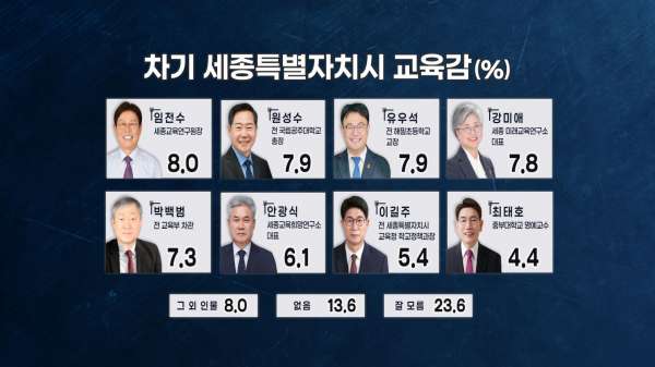 임전수 세종교육연구원장 8.0%, 원성수 전 국립공주대학교 총장 7.9%, 유우석 전 해밀초 교장 7.9%, 강미애 세종미래교육연구소 대표 7.8%, 박백범 전 교육부 차관 7.3%, 안광식 세종 교육희망연구소 대표 6.1%, 이길주 전 세종시교육청 학교정책과장 5.4%, 최태호 중부대학교 명예교수 4.4%, 잘 모름 23.6%, 없다 13.6%, 그 외 8.0%