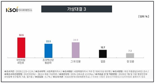 최민호 현 세종시장(국민의힘) 32.5%, 황운하 현 국회의원(조국혁신당) 22.5%
