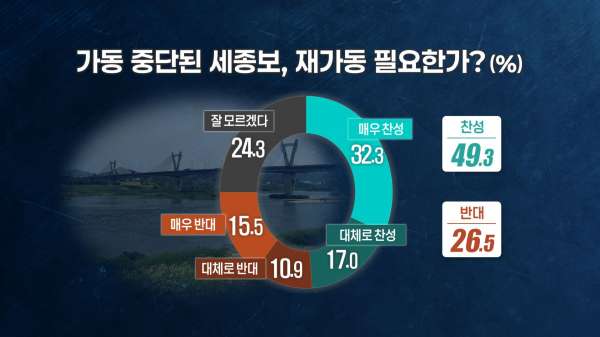 세종보 재가동에 대해 찬성한다 49.3%, 재가동에 반대한다 26.5%, 잘 모르겠다 24.3%