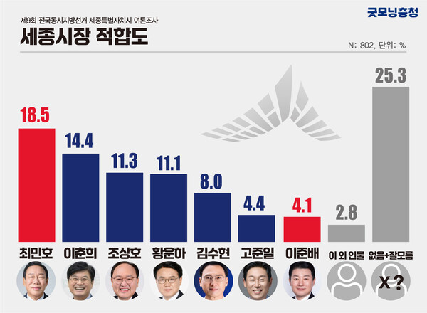 최민호 현 시장 18.5%, 이춘희 전 세종시장(민주당) 14.4%, 조상호 전 세종시 경제부시장(민주당) 11.3%, 황운하 국회의원(조국혁신당) 11.1%, 김수현 더민주세종혁신회의 상임대표(민주당) 8.0%, 고준일 전 세종시의회 의장(민주당) 4.4%, 이준배 전 세종시 경제부시장(국민의힘) 4.1%, 그 외 다른 인물 2.8%, 적합인물 없다 10.5%, 잘 모르겠다 14.8%