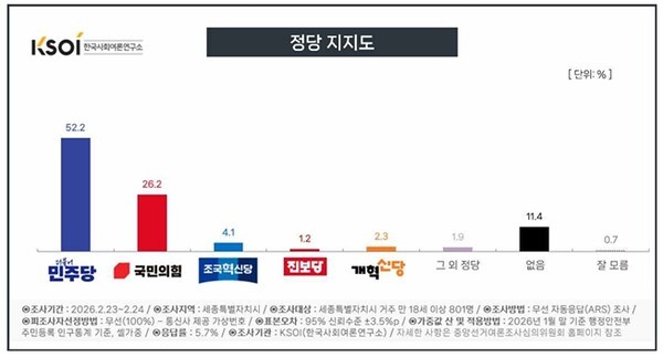 더불어민주당 52.2%, 국민의힘 26.2%, 조국혁신당 4.1%, 개혁신당 2.3%, 진보당 1.2%, 그 외 정당 1.9% 없음 11.4%, 잘 모름 0.7%