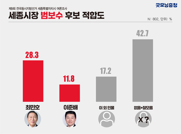 최민호 28.3%, 이준배 11.8%, 이 외 후보 17.2%, 적합한 후보가 없다 27.7%, 잘 모르겠다 15.0%