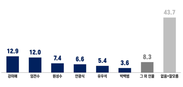 임전수 세종교육연구원장 9.4%, 박백범 전 교육부 차관 9.3%, 강미애 세종 미래교육연구소 대표 7.2%, 유우석 전 해밀초 교장 7.2%, 안광식 세종교육희망연구소 대표 5.6%, 최태호 중부대학교 명예교수 4.8%, 원성수 전 국립공주대학교 총장 4.7%, 이길주 전 세종시교육청 학교정책과장 4.7%, 그 외 6.5%, 없다 17.9%, 모름 22.6%