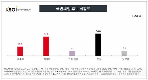 최민호 현 시장 31.8%, 이준배 전 세종시 경제부시장 15.0%, 그 외 인물 8.0%, 없음 36.8%, 잘 모름 8.4%