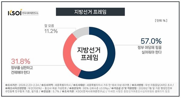 정부여당에 힘을 실어줘야 한다 57.0%, 정부를 심판하고 견제해야 한다 31.8%, 잘 모름 11.2%