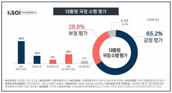 긍정평가 65.2%, 부정평가 28.8%, 잘 모름 6.0%