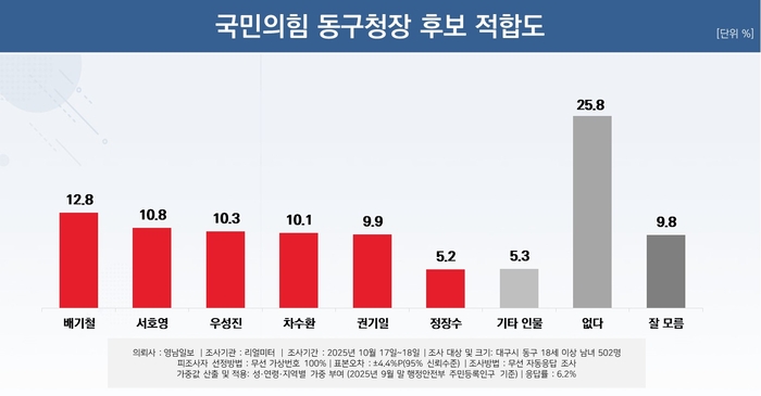 * 대구 동구 지방선거 조사 개요 △의뢰: 영남일보 △조사기관: ㈜리얼미터 △조사 일시: 2025년 10월17~18일(2일간) △대상: 대구 동구 지역에 거주하는 만18세 이상 성인 남녀 502명 △조사방법: 구조화된 설문지를 이용한 자동응답(ARS) 조사 △피조사자 선정 방법: 무선 가상번호(SKT·KT·LGU+ 이동통신사 제공 무선 가상번호) 100% △응답률: 6.2% △오차 보정 방법: 2025년 9월 말 행정안전부 발표 주민등록 인구통계기준 셀가중 방식으로 성별·연령대별·지역별 가중치 부여 △표본오차: 95% 신뢰수준에 ±4.4%포인트 △내용: 정당 지지도 및 대구 동구청장 후보 지지도·적합도 등 ※자세한 내용은 중앙선거여론조사심의위원회 홈페이지 참조