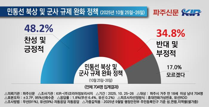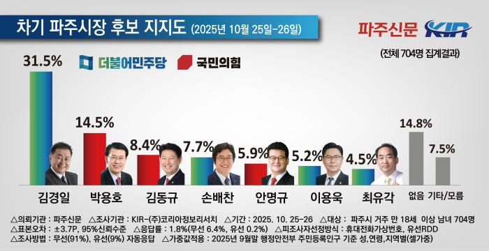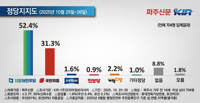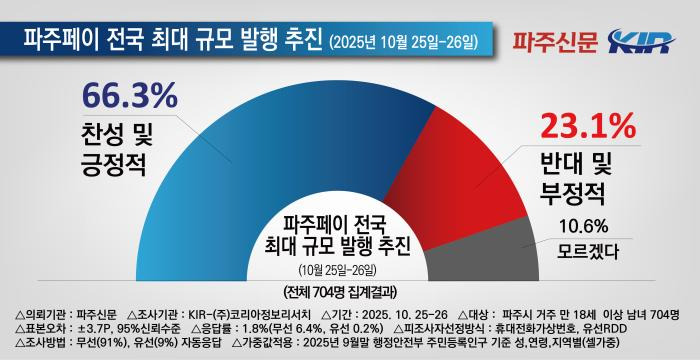 * 본 조사는 파주신문이 여론조사기관 코리아정보리서치에 의뢰하여 10월 25일, 26일 이틀간 파주시 거주 만 18세 이상 남녀 704명을 대상으로, 무선전화 가상번호(91%)와 유선전화 RDD(9%)를 이용하여 자동응답 방식으로 진행됐다. 응답률은 1.8%(무선전화 6.4%, 유선전화 0.2%)이고, 표본오차는 95%의 신뢰수준에 ±3.7%p다. 통계보정은 2025년 9월 말 행정안전부 발표 주민등록 인구 기준 성, 연령, 지역별 셀가중값을 부여했다. 보다 자세한 내용은 중앙여론조사심의위원회 홈페이지(https://www.nesdc.go.kr)를 참고하면 된다.