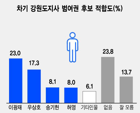 김진태 지사 31%, 이광재 전 강원도지사 23%, 우상호 대통령실 정무수석 17%, 염동열 전 국회의원 2%, ‘모름/응답거절’ 26%, ‘그 외 인물’ 0%