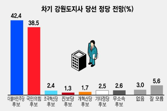 - '국민의힘 승리' 응답은 강릉 39.6%, 춘천-철원-화천-양구 39.3%, 홍천-횡성-영월-평창 39% 순으로 높았다.
