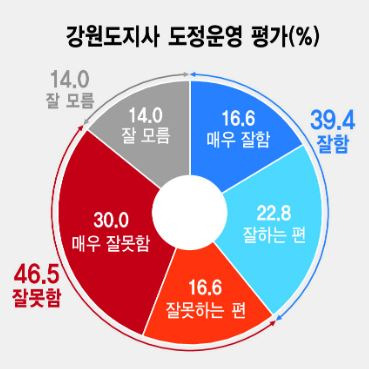 - 지역별 부정 평가는 춘천-철원-화천-양구가 49.3%로 가장 높았고, 긍정 평가는 동해-태백-삼척-정선이 43.1%로 최고였다. 연령대별로는 70세 이상의 긍정 평가가 61.0%로 가장 높았고 60대가 47.4%로 뒤를 이었다.