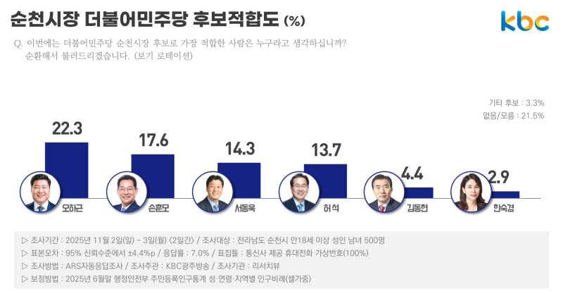 오하근 전 후보 22.3%, 손훈모 변호사 17.6%, 서동욱 도의원 14.3%, 허석 전 시장 13.7%, 김동현 전 기획조정실장 4.4%, 한숙경 도의원 2.9%