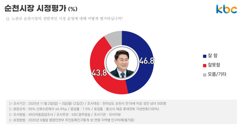 KBC 광주방송 의뢰, 리서치뷰 11월 2~3일 순천에 거주하는 만 18살 이상 유권자 500명 대상 조사