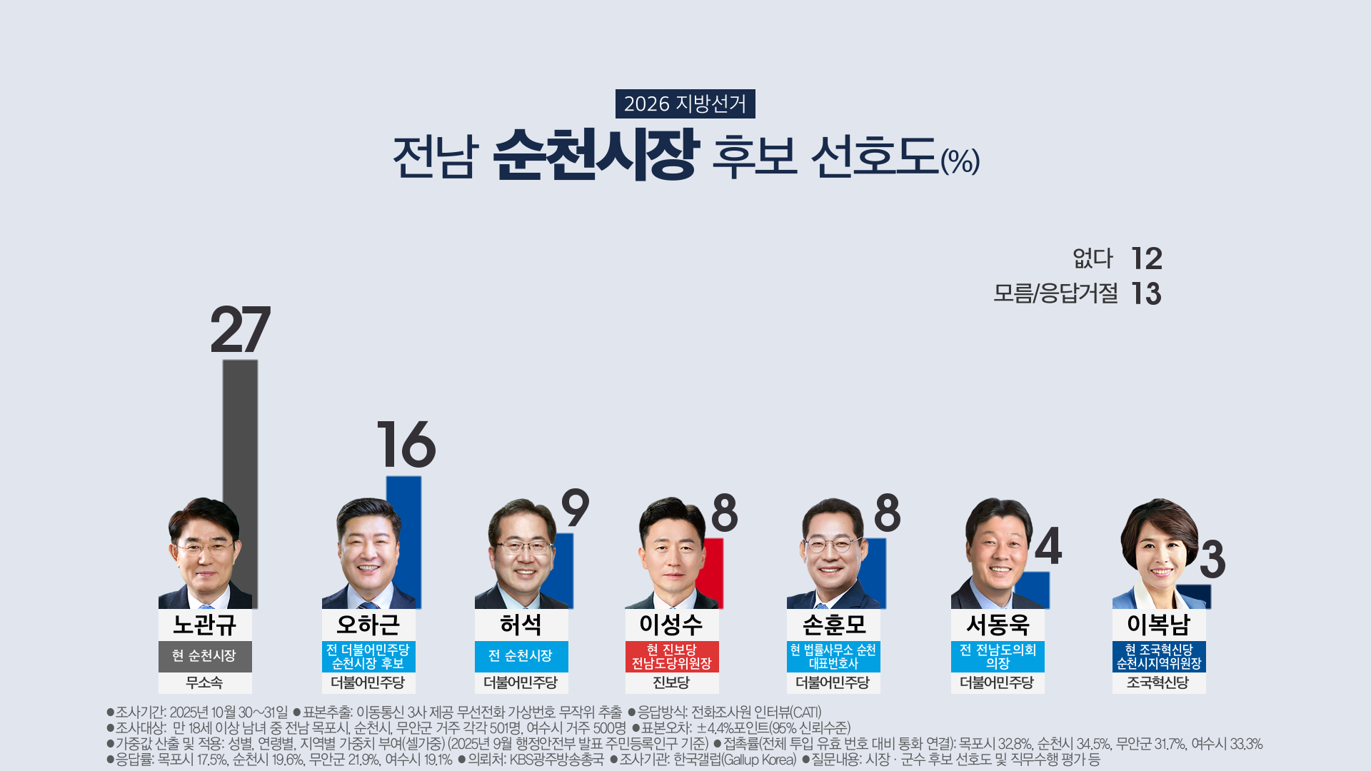 노관규 시장 27%, 오하근 전 민주당 순천시장 후보 16%, 허석 전 순천시장 9%, 이성수 진보당 전남도당 위원장과 손훈모 법률사무소 순천 대표 변호사 각각 8%, 서동욱 전 전남도의회 의장 4%, 이복남 조국혁신당 순천시 지역위원장 3%, 선호 후보가 없다 12%, 모름이나 응답거절 13%