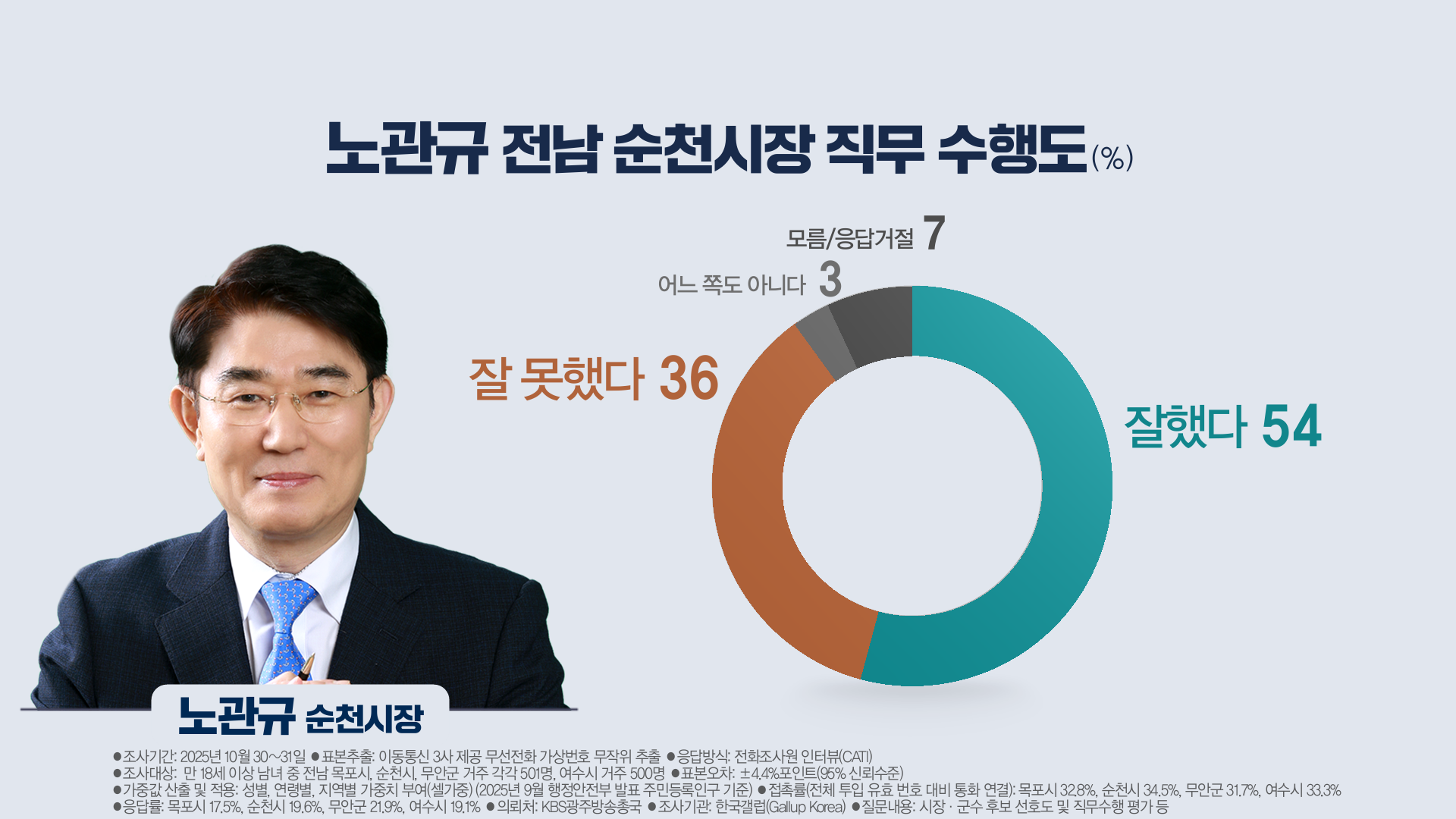 * 이번 조사는 KBS광주방송총국이 한국갤럽에 의뢰해 지난달 30일부터 31일까지 전남 순천 거주 만 18세 이상 남녀 501명을 대상으로 무선전화 가상번호를 활용한 전화조사원 면접 방식으로 실시했습니다. 응답률은 15.2%, 표본오차는 각각 95% 신뢰수준에 ±3.5% 포인트입니다.