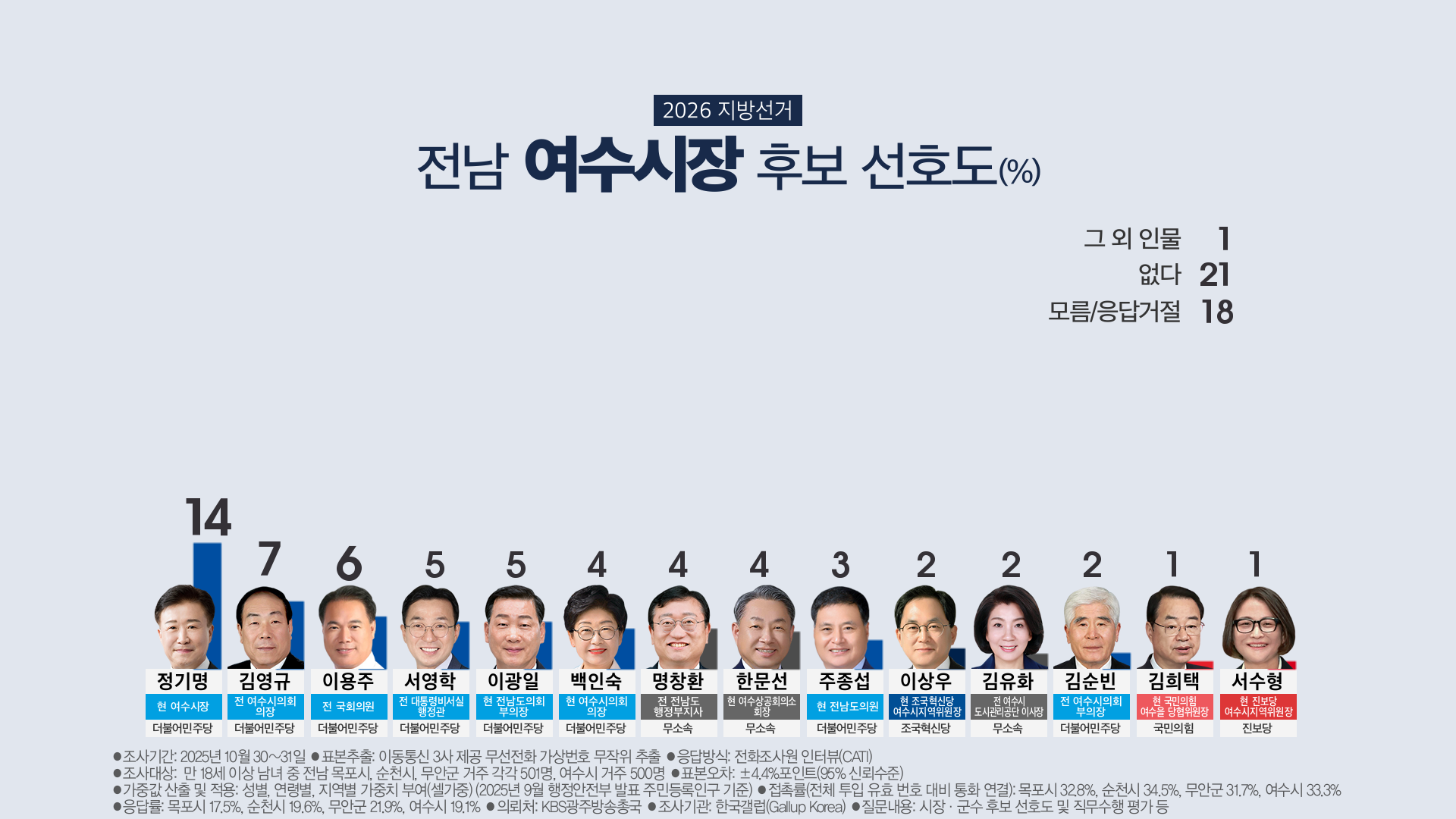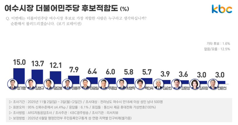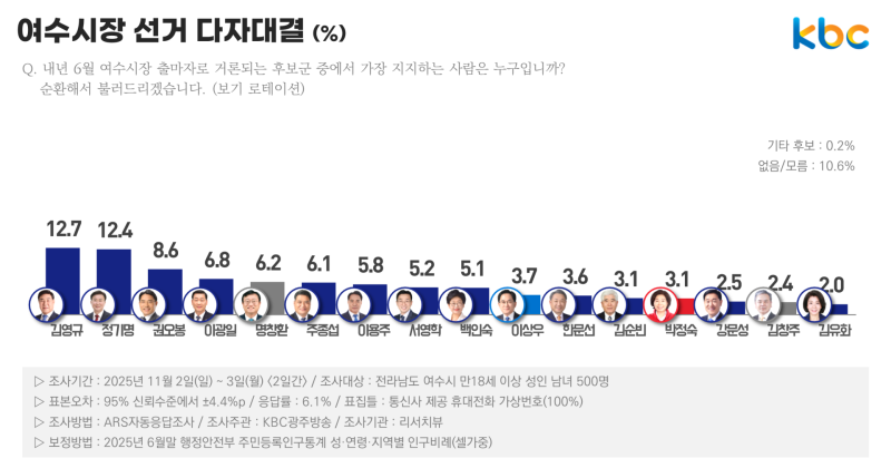 김영규 시의원 12.7%, 정기명 시장 12.4%, 권오봉 전 여수시장 8.6%, 이광일 전남도의회 부의장 6.8%, 명창환 전 전남도 행정부지사 6.2%, 주종섭 전남도의원 6.1%, 이용주 전 국회의원 5.8%, 서영학 기본사회 여수본부 상임대표 5.2%, 백인숙 여수시의회 의장 5.1%, 이상우 조국혁신당 여수시 지역위원장 3.7%, 한문선 여수상의 회장 3.6%, 김순빈 전 여수시의회 부의장 3.1%, 박정숙 국민의힘 여수시당협위원장 3.1%, 강문성 전남도의원 2.5%, 김창주 전 여수경영인협회 회장 2.4%, 김유화 전 여수시도시관리공단 이사장 2.0%