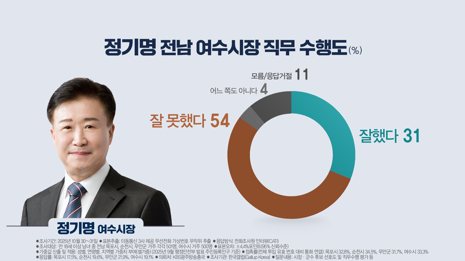 * 이번 조사는 KBS광주방송총국이 한국갤럽에 의뢰해 지난달 30일부터 31일까지 전남 여수 거주 만 18세 이상 남녀 500명을 대상으로 무선전화 가상번호를 활용한 전화조사원 면접 방식으로 실시했습니다. 응답률은 15.2%, 표본오차는 각각 95% 신뢰수준에 ±3.5% 포인트입니다.
