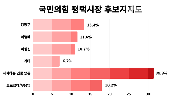 강정구 현 평택시의회 의장 13.4%, 이병배 전 평택시장 예비후보 11.6%, 이상진 전 주뉴질랜드 대한민국 대사 10.7%, 지지하는 인물이 없다 39.3%, 잘 모르겠다/무응답 18.2%, 기타 다른 인물 6.7%
