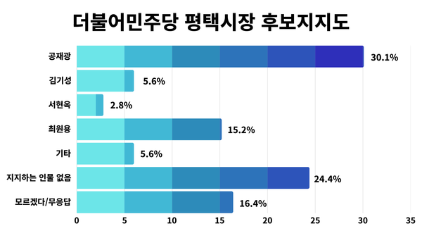 공재광 전 평택시장 30.1%, 최원용 현 더불어민주당 정청래 당대표 특보 15.2%, 김기성 전 평택시장 예비후보 5.6%, 서현옥 현 경기도의원 2.8%, 기타 다른 인물 5.6%, 지지하는 인물이 없다 24.4%, 잘 모르겠다/무응답 16.4%