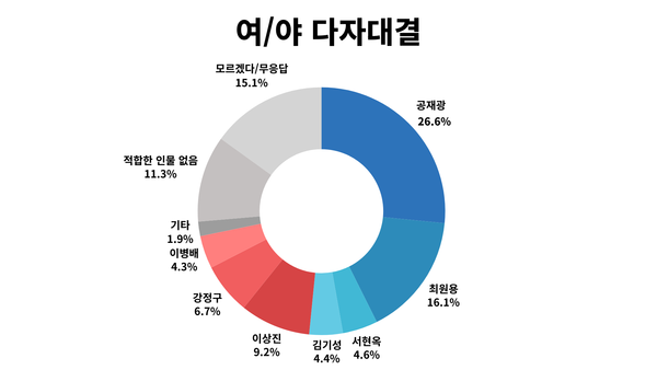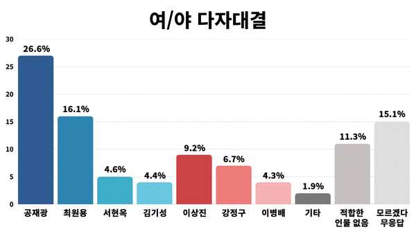 - 더민주 지지층은 공재광 전 시장(33.8%), 최원용 특보(27.7%), 김기성 전 예비후보(5.4%) 순으로 힘을 보탰으며, 국민의힘 지지층은 공재광 전 시장(23.5%), 이상진 전 대사(16.7%), 강정구 의장(14.1%) 순으로 높은 지지율을 보였다.